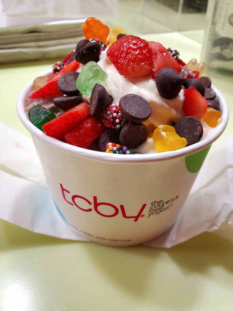 I’ve been wanting to try this frozen yogurt place for a long time but never got around to it. This seemed like the perfect time. O – M – G. If you haven’t tried TCBY fo-yo foods yet, put it on your to do list! Some of their frozen yogurt flavors include oreo cookies and cream, honey vanilla, chocolate, vanilla, coffee, toasty marshmallow, graham cracker, peanut butter, cake batter, butter pecan, and white chocolate mousse. They also have orange, chocolate, and watermelon sorbet flavors. Some flavors are sugar free, dairy free, and/or gluten-free, if you’re into that. I am biased to a good chocolate and vanilla swirl yum with strawberries and dark chocolate yuuum. Because I was celebrating, I also added some sprinkle nonpareils and a couple gummy bears 🤯. The first bite sent my taste buds to the moon and I was sad when it was gone. They really live up to their name of “The Country’s Best Yogurt”